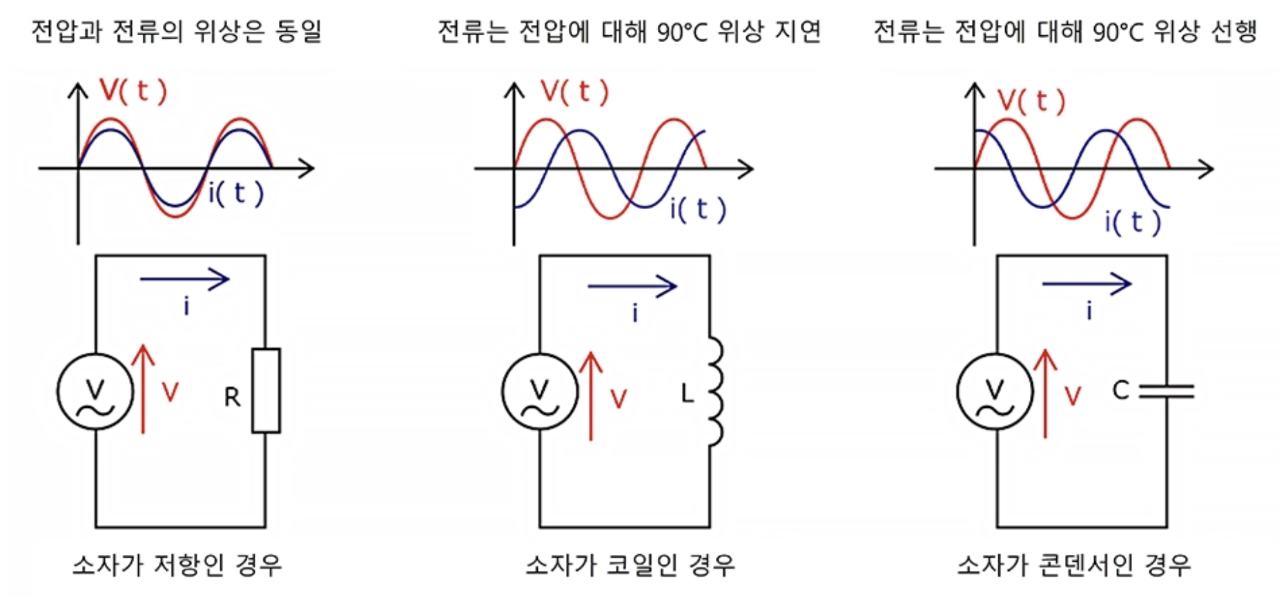 이처럼 저항, 코일, 콘덴서는 각각 전압과 전류의 위상 관계를 다르게 만든다. 저항에서는 전압과 전류가 같은 위상, 코일에서는 전류가 지상, 콘덴서에서는 전류가 진상이라는 관계는 교류 회로에서 가장 기본이 되는 공식과도 같은 개념이다. 전기기사 시험에서는 이 관계를 단순 암기가 아닌 이해 여부를 묻는 문제로 자주 출제한다.